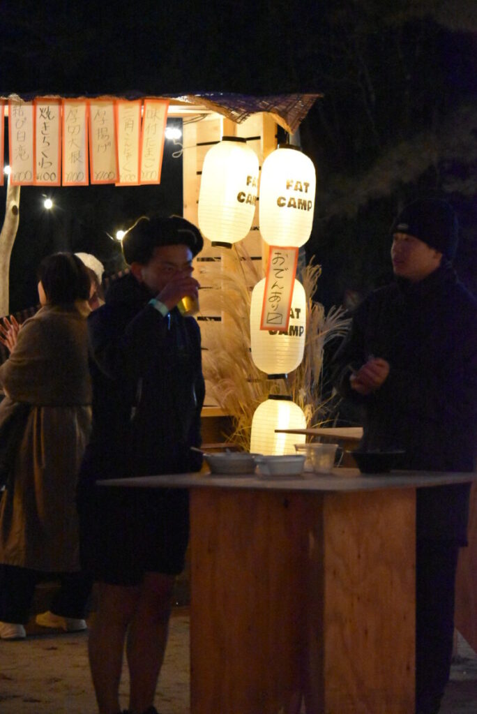 音楽アーティストやキッチンカーに飲食ブース、移動式サウナ、プロボクサーによるスパーリング体験、焚き火専用サングラスの販売、各ワークショップ、一晩明けてからの朝ヨガ、流木アートetc、会場を彩るブースが立ち並ぶ中、私は現場から出た端材薪の販売と焚き火提供、現場監督の佐和田さんが作ったイスなどの販売をいたしました!
